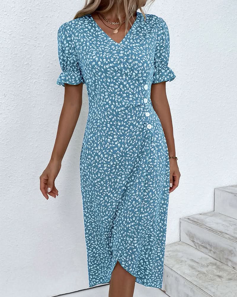 Oplev Ubesværet Elegance med Kjolen Gloria™! Træd ind i en verden af tidløs elegance med V-Neck Fresh Bloom Kjolen. Denne kjole er mere end bare et stykke tøj – det er en oplevelse, der fremhæver din naturlige skønhed.