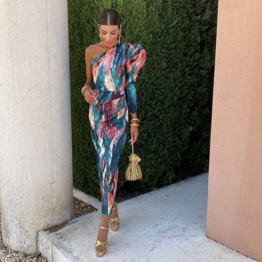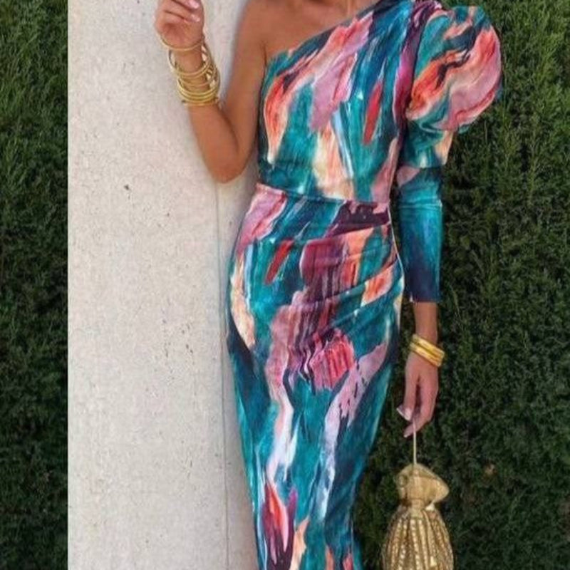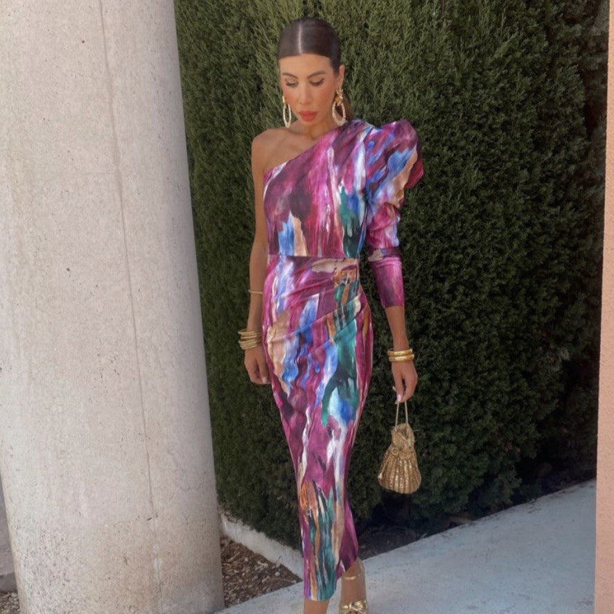 • Uforglemmeligt silhuet med én skulder og dristige lilla prints