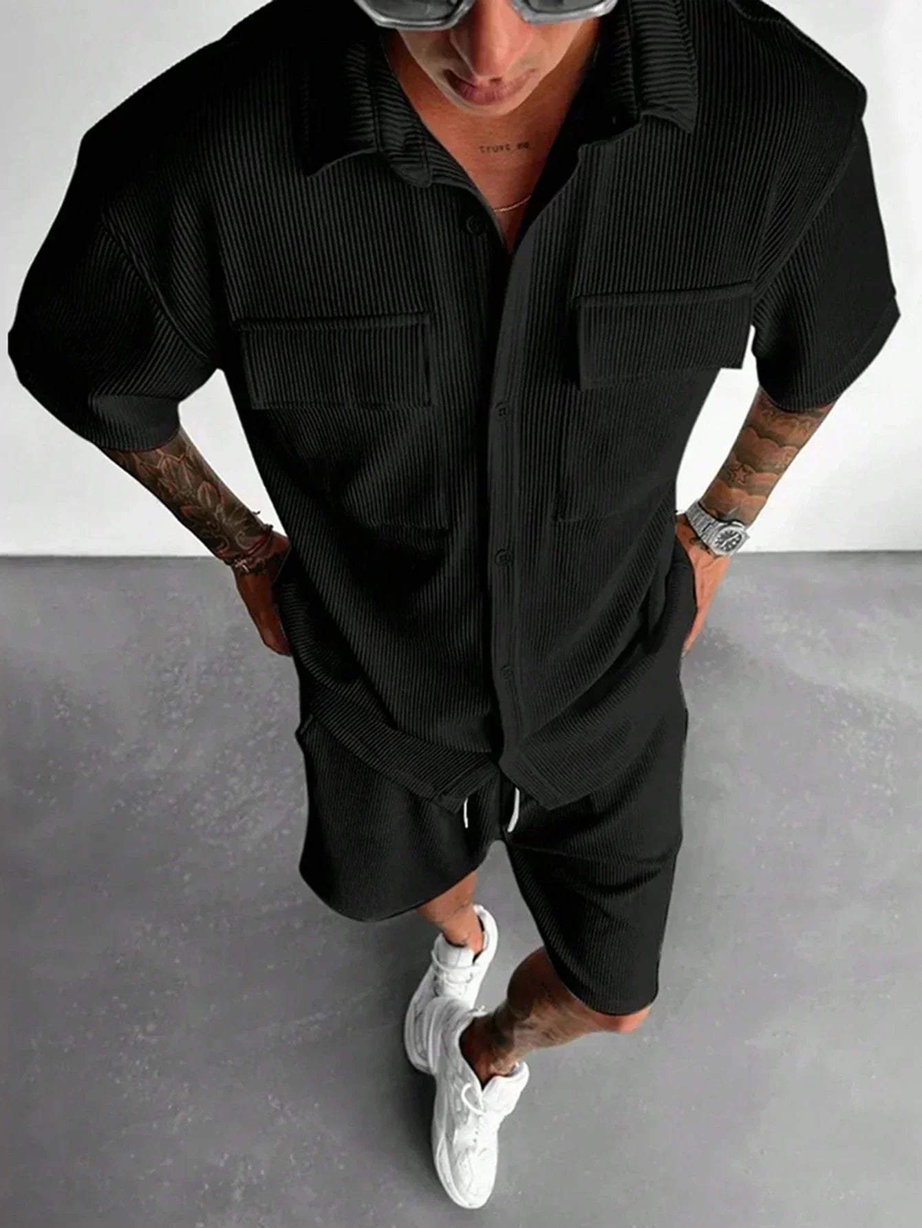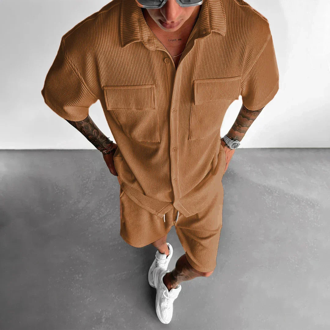 MALTHE™ Utility Sæt forener funktionelt design med moderne komfort. Sættet består af en struktureret skjorte med brystlommer og matchende shorts – fremstillet i blødt, ribbet stof, der giver både dybde og bevægelsesfrihed.