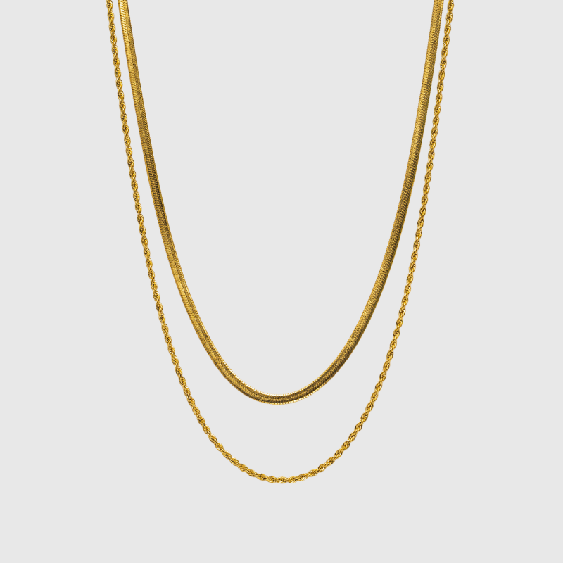 Strål på, pigen! Lily Layers halskæde har en elegant fiskebensmønstret kæde og en sød rebkæde. Denne PVD 18k guldbelagte skønhed er perfekt til stranddage eller dateaftener og er lavet til at blive båret hver dag - du vil aldrig tage den af!