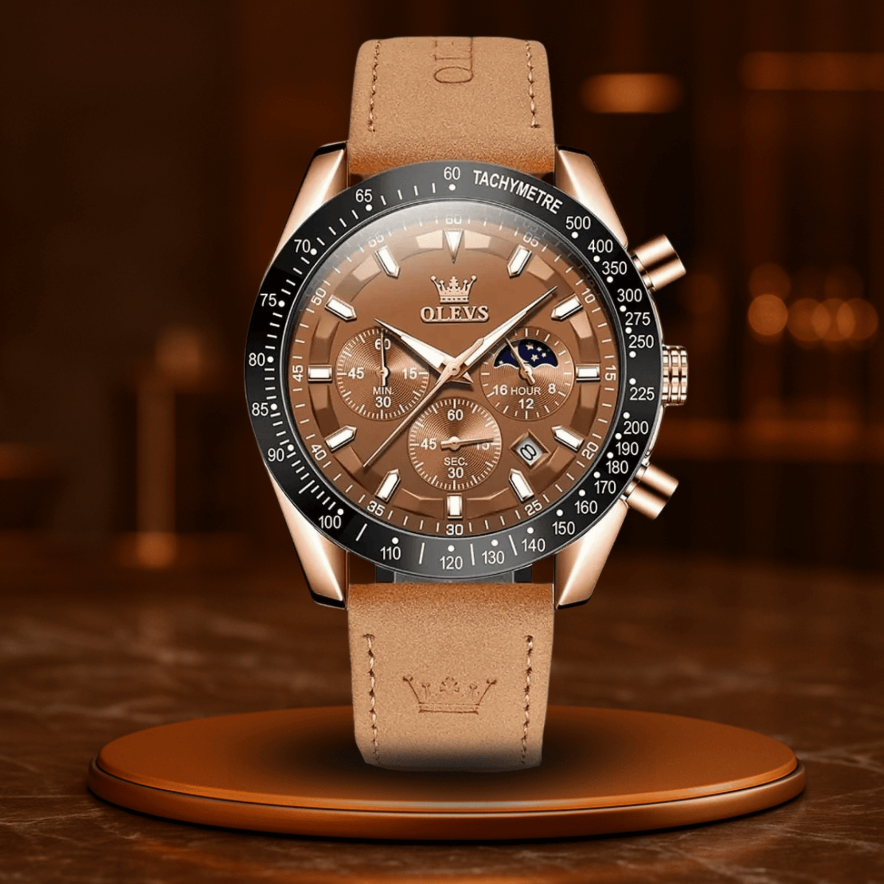 Lunaris Chrono er lavet til mænd, der ikke bare planlægger, men skaber. Dens elegante, slanke design med brunt ægte læderarmbånd bringer klassisk elegance til dit håndled, mens det præcise kvartsurværk sikrer, at hvert sekund tæller.