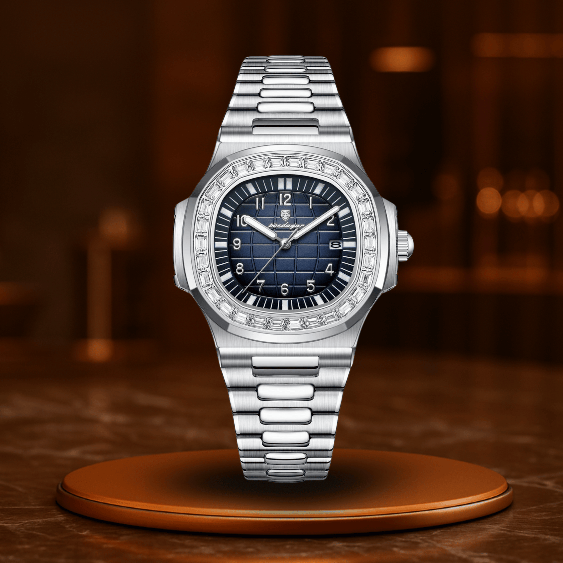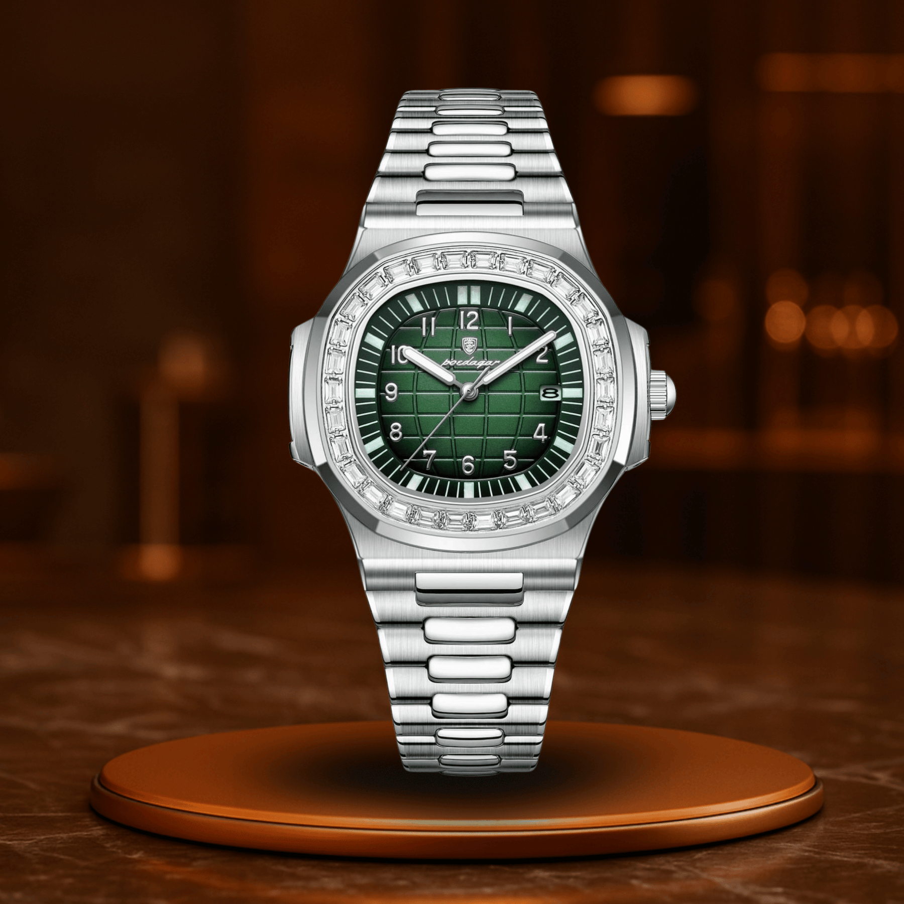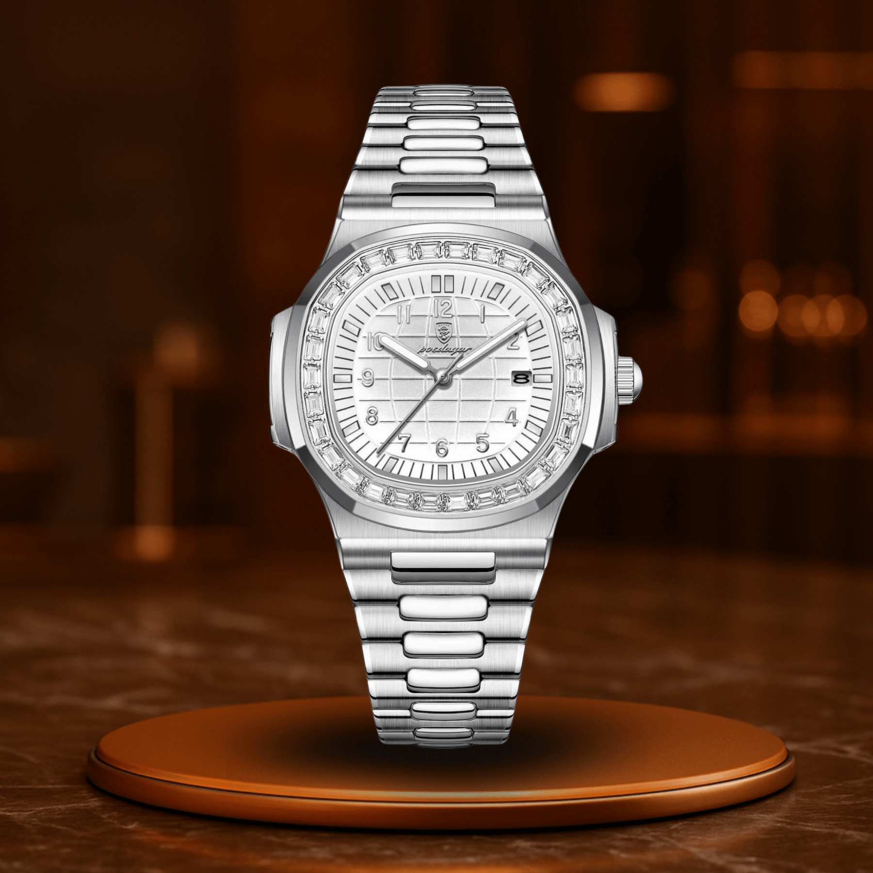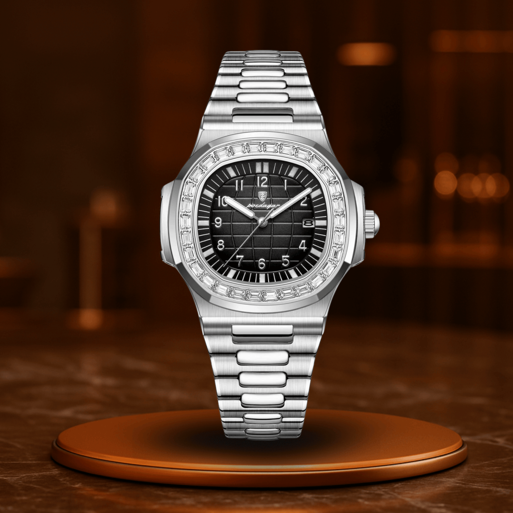Det præcise kvartsurværk sikrer perfekt tidsføring, datovisningen holder dig organiseret, og de lysende visere står klar, når lysene slukkes – men din tid fortsætter.