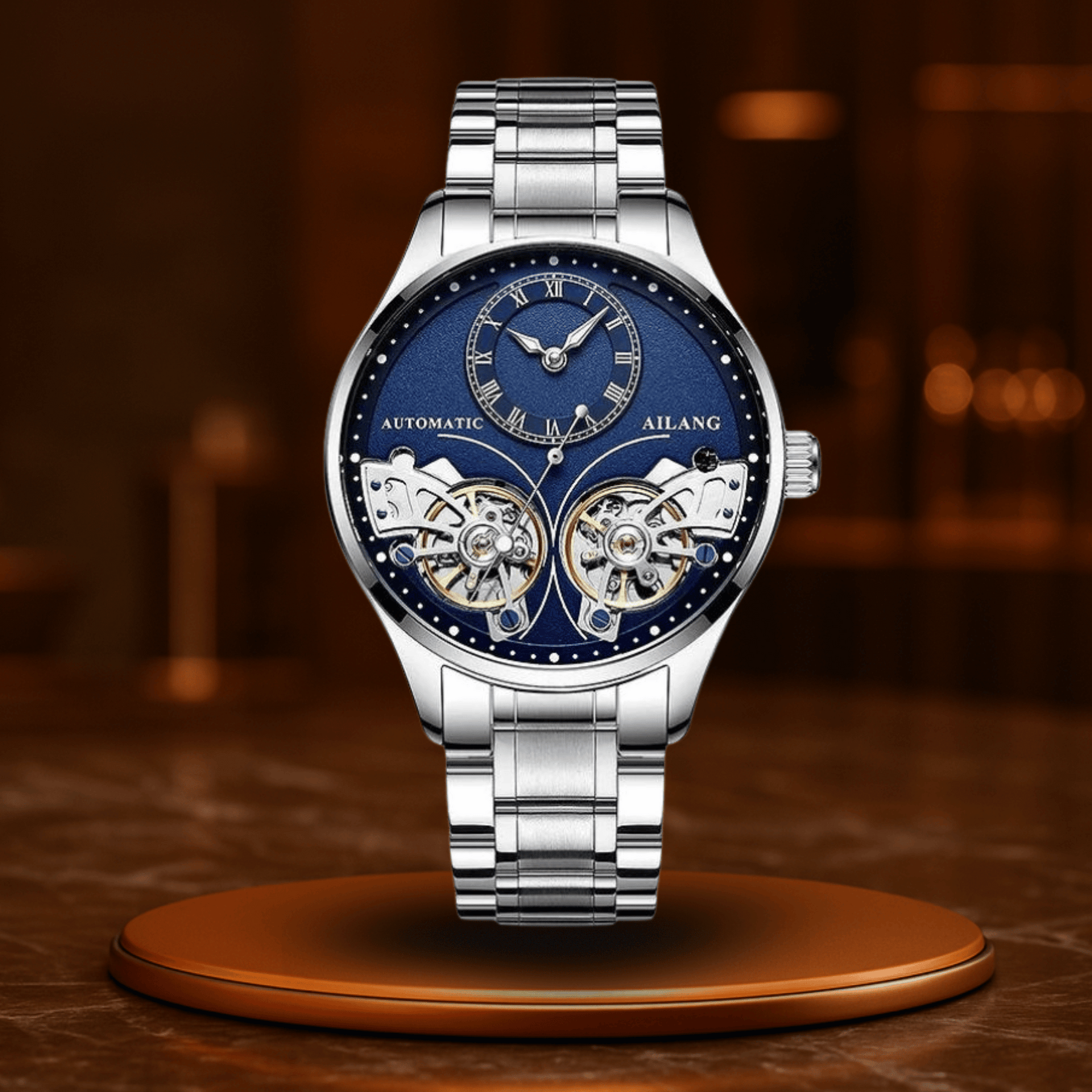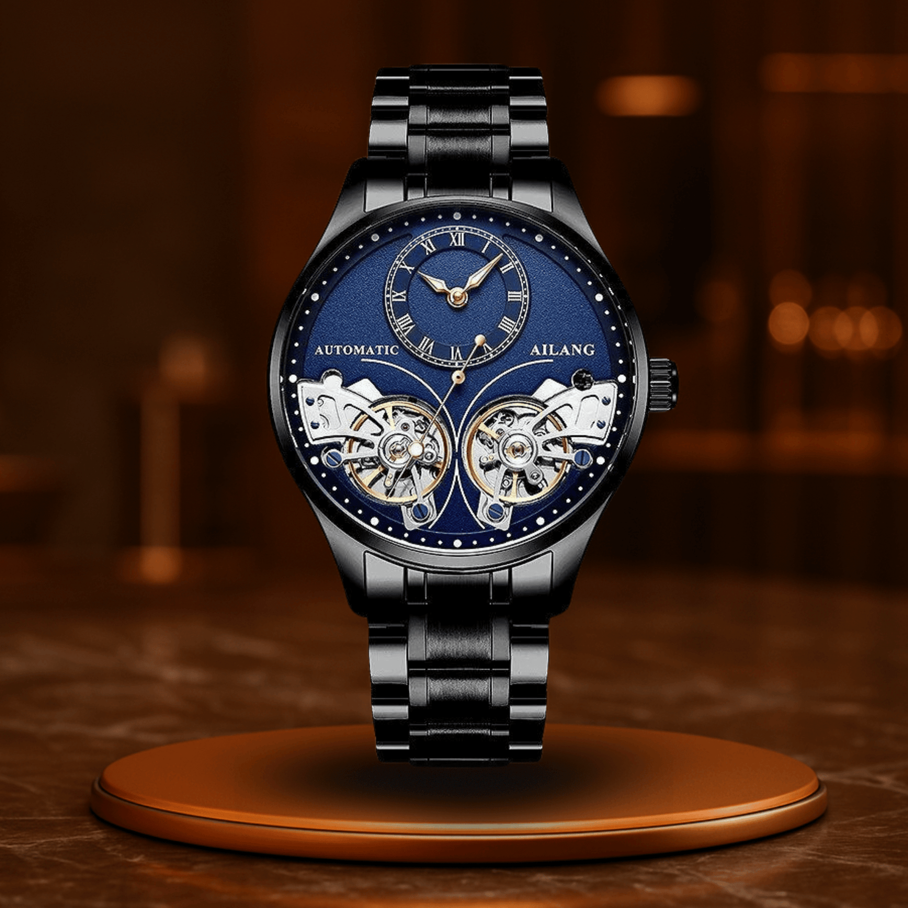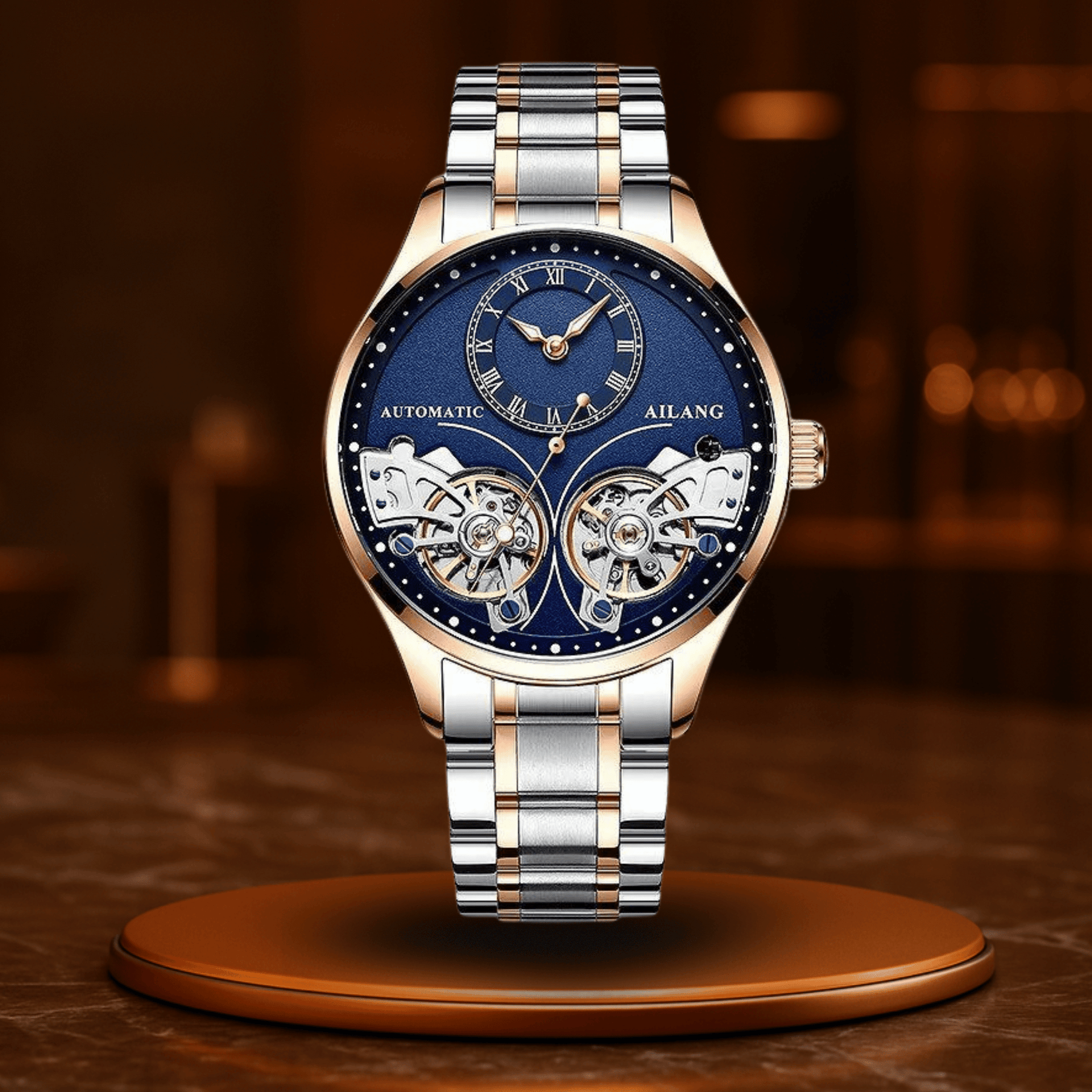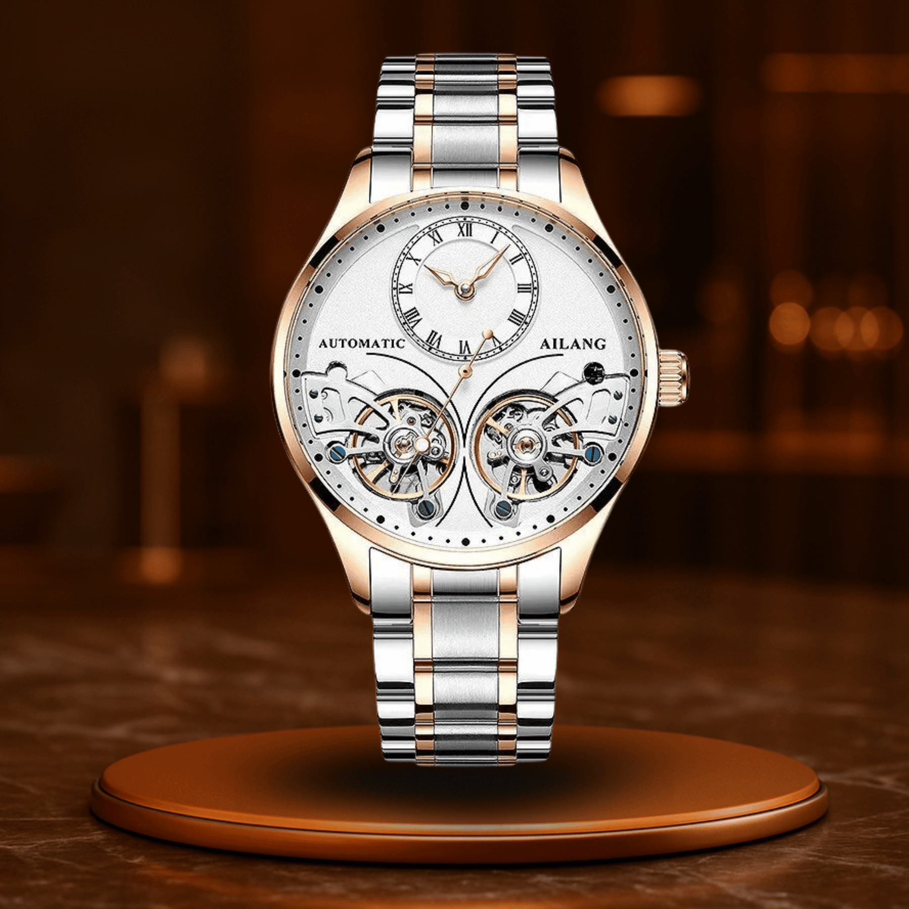 Et dobbelt lagret mekanisk hjerteslag, synligt og hypnotisk, båret af et automatisk urværk, der stoler på din energi. Ingen optræk. Ingen batteri. Kun dig - og tiden, som ikke kunne gå smukkere.